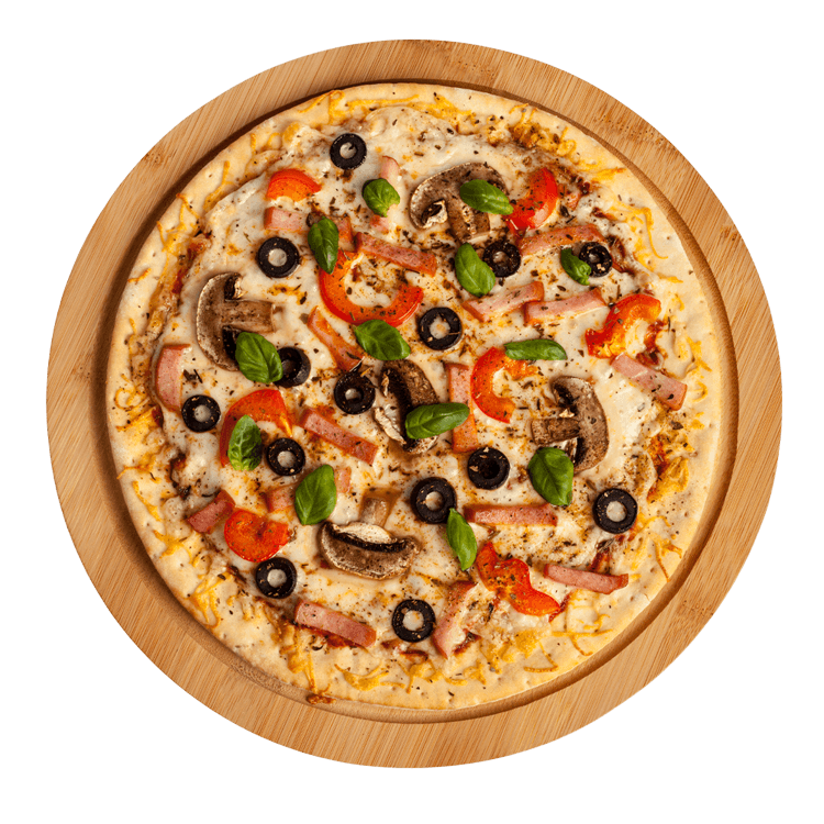 Tomatensoße, Mozzarella, Oregano, Hinterkochschinken, Artischocken, Champignon, Oliven